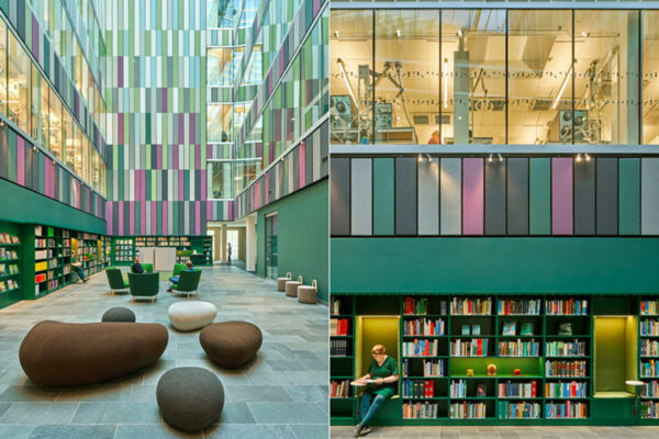 – Vårt nära samarbete med Cedervall Arkitekter, Akustikmiljö och Flexplåt resulterade delvis i ljudabsorbenter bakom de ribbade träpanelerna vid entréerna som Jörgen berättar om, men även cirka 2 500 m2 plåtbeklädda akustikväggar för att skapa en lugn och trivsam universitetsmiljö.